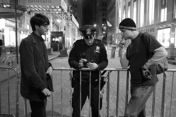8 October 2011 Two protesters welcome passersby to ask them questions about the meaning and goals of the Occupy Wall Street movement. “We love police. We love rich people. It’s the system we oppose!!” says their sign.