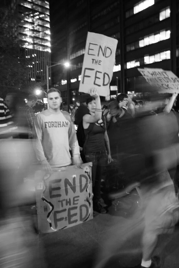 8 October 2011 In Zuccotti park, lined-up protesters hold signs in front of passersby.